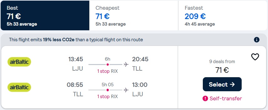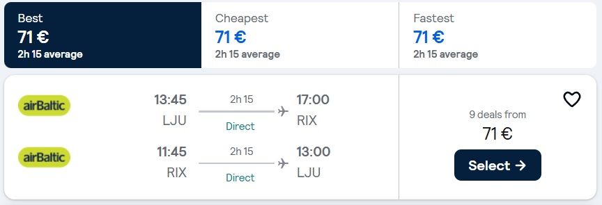 Od predlani družba Air Baltic povezuje slovensko in latvijsko prestolnico. Leti do Rige v tem času potekajo dvakrat na teden, kar pomeni super vikend oddih na Baltiku ali pa daljše počitnice ob dolgih peščenih plažah v poletnem času. Povratne karte so z direktnim letom na voljo že od 71€, v akciji prevoznika pa so tudi super povezave z enim ekspresnim prestopom, in sicer v Oslo, Stockholm, Kopenhagen, Helsinke, Vilno in Talin, prav tako od neverjetnih 71€ dalje! V osnovni ceni je vključena ročna prtljaga do 8 kilogramov (malim kovček), doplačilo za oddano prtljago pa ni veliko.