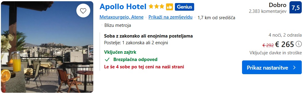 Apollo Hotel*** – 133€ (265€ za dve osebi z Genius popustom, sicer 292)