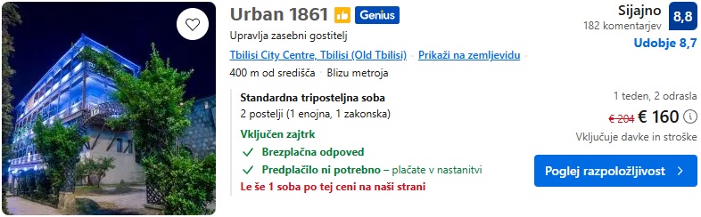 Primer nastanitve z vključenim zajtrkom in možnostjo brezplačne odpovedi za izbrani termin (Tbilisi, 8.11.2025 – 15.11.2025)**:
