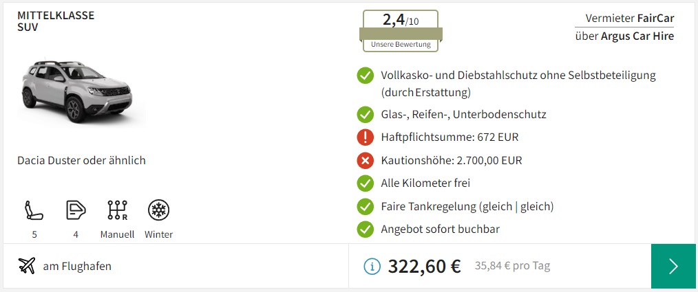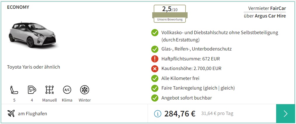 **V vseh primerih morate iskanje pognati sami glede na svoje izbrane lete in časovnice letov. Za rezervacijo priporočamo avtomobile, ki imajo pozavarovano odbitno franšizo (“ohne Selbstbeteiligung durch Erstattung”).