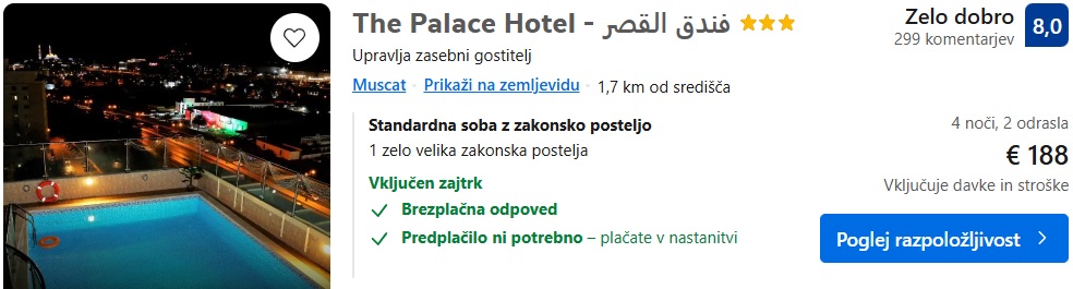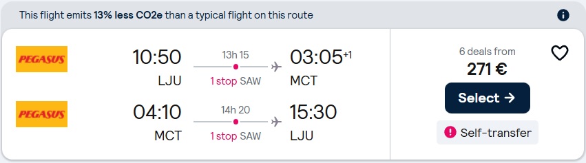 Z Brnika lahko zares ugodno poletite do prestolnice Muškat. Od 25. januarja naprej bo namreč turški nizkocenovnik Pegasus trikrat tedensko povezoval Ljubljano z Istanbulom (Mednarodno letališče Sabiha Gökçen), kar omogoča super povezave za nadaljevanje počitnic v Aziji. V Oman tako lahko poletite že od 271€ naprej! V osnovni ceni je vključena mala ročna prtljaga (40x30x15 cm), z doplačilom le 20€ na let pa vam je dodatno na voljo velika ročna prtljaga (55x40x20 cm) ter oddana prtljaga do 20 kilogramov v kolikor karte kupite direktno na strani prevoznika (preko povezave na SkyScannerju). Naj vas ob tem opozorimo, da leti med seboj niso povezani, tako da si je med prestopi potrebno zagotoviti dovolj časa. V Omanu so zelo ugodne tudi namestitve (več spodaj v prispevku).
